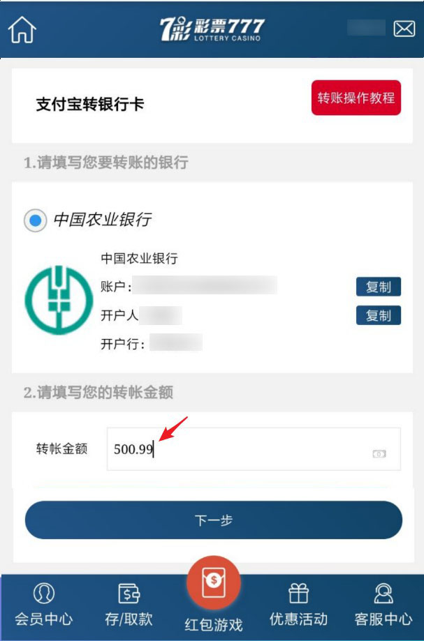请您记录好公司收款银行账户,填写您的转账金额,点击下一步。