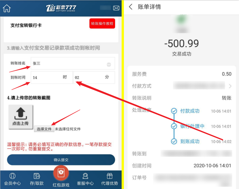 第五步:当您的支付宝款项到达公司收款账号内时,您的支付宝账单详情会显示到账成功,您在登陆平台提交下您的存款数据,财务人员在查收到您的款项,核对您的存款数据无误后,会在3分钟内为您添加额度,刷新页面即可查收。